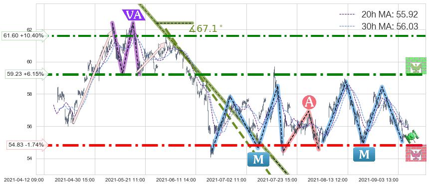 ♘ 阻力价格位59.23,可信任强度90.60%,距离最后交易2021-09-09 14:00形成的收盘价格55.80相差 +6.15%