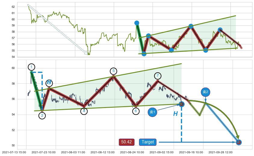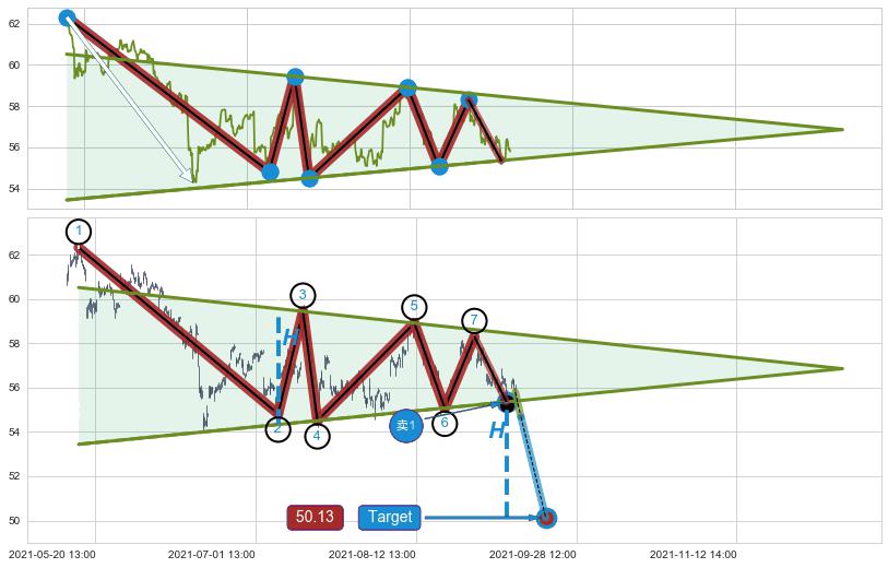 ➢ 最小中继整理跌幅→𝐇: 5.23 (低点逐步抬高斜边第一支撑点②与阻力边垂直距离)