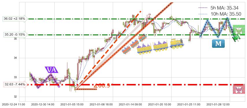 ♘ 支撑价格位32.63,可信任强度93.85%,距离最后交易2021-01-28 16:00形成的收盘价格35.25相差 -7.44%