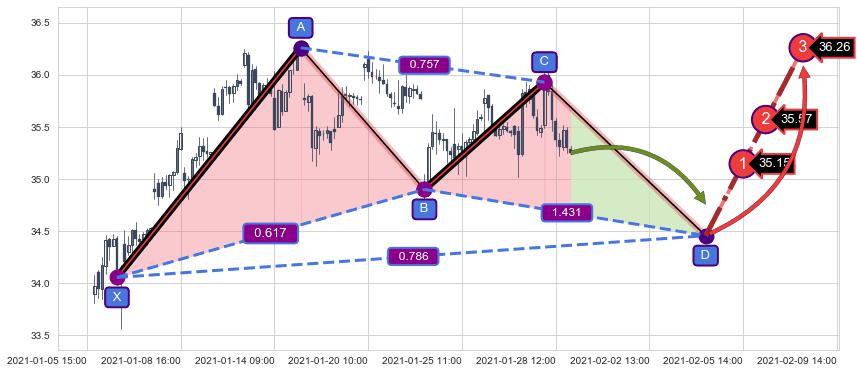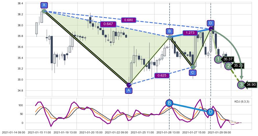 ➣ D点拟合预测价格34.46,距离最后交易收盘价格35.25相差 -2.25%