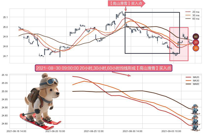 ⚀ 2021-08-20 14:00:00小时-2021-09-07 10:00:00小时显现 20小时-30小时-60小时均线 【高山滑雪】买入点 看多信号,后市看涨,买入