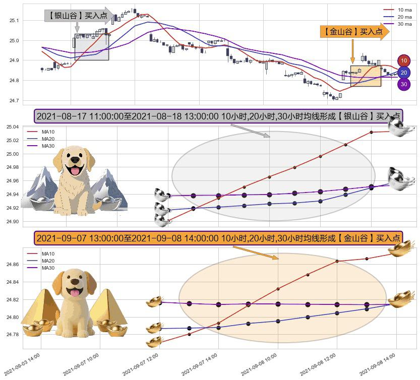 ⚃ 2021-09-07 14:00:00-小时至2021-09-08 14:00:00-小时显现 10小时-20小时-30小时均线 【金山谷】买入点 其再次确认了买入信号,可靠性更强,买入