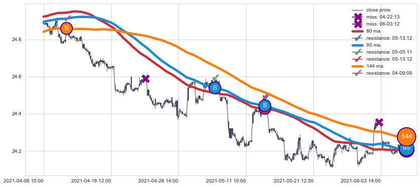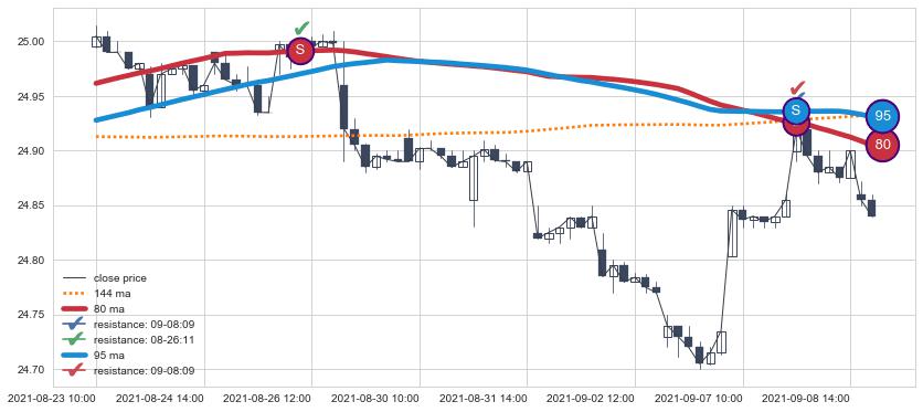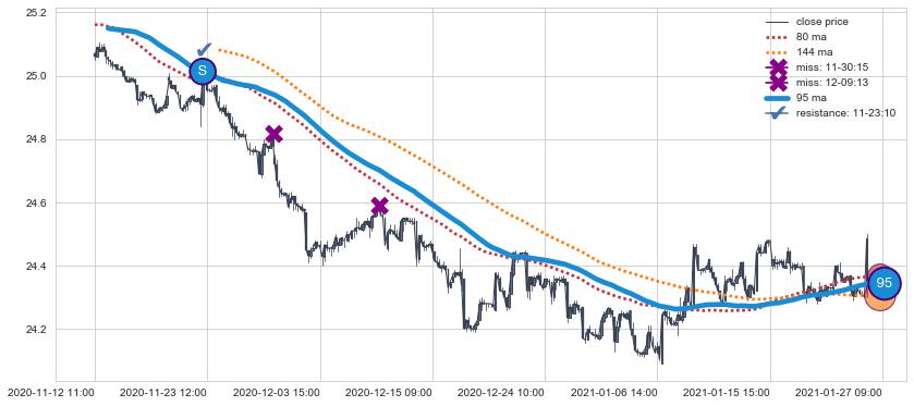 ⚄ 价格在均线遇到阻力后再次向下回落了【较短】距离, 第⑦卖出点 阻力效果【仍需验证】