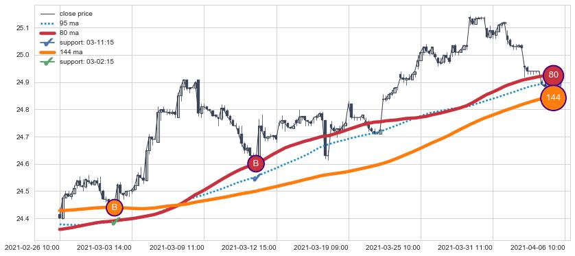 ⚁ MA3和MA8走势平行,且始终保持在短距离内,MA21始终在短中期均线上方,与短中期均线保持一定的距离,微微下行
