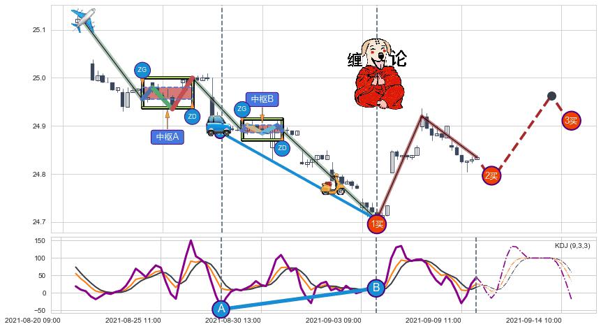 ➣ 【中枢B】:08-30:09-08-31:11,中枢由5笔构成,共9交易小时, ZG=24.90, ZD=24.89