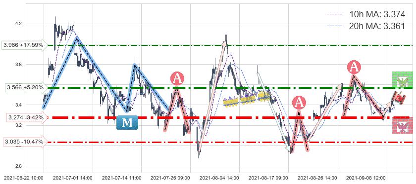 ♘ 阻力价格位3.566,可信任强度72.03%,距离最后交易2021-09-09 14:00形成的收盘价格3.390相差 +5.20%