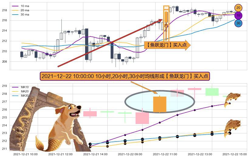 形态多维评估: ⚀ 2021-12-22 10:00:00小时显现 10小时-20小时-30小时均线 【鱼跃龙门】买入点 看多信号,后市看涨,买入