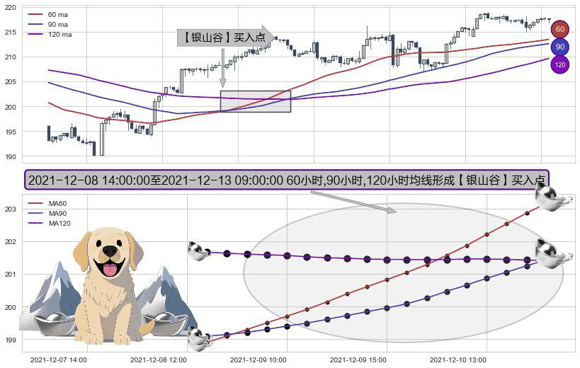 形态多维评估: ⚀ 2021-12-08 15:00:00-小时至2021-12-13 09:00:00-小时显现 60小时-90小时-120小时均线 【银山谷】买入点 看多信号,后市看涨,买入