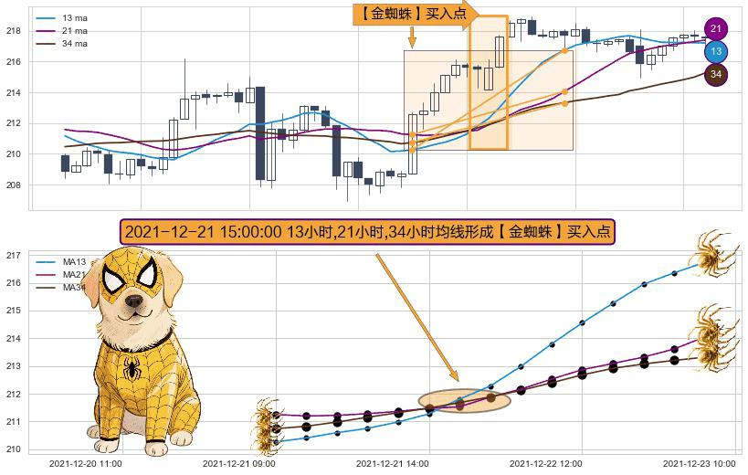 形态多维评估: ⚀ 2021-12-21 15:00:00小时显现 13小时-21小时-34小时均线 【金蜘蛛】买入点 看多信号,后市看涨,买入