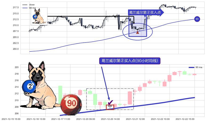 形态多维评估: ⚀ 2021-12-20 12:00:00-小时显现 葛兰威尔均线 90小时均线 第②买入点 上升趋势的中继信号,后市看涨,买进信号