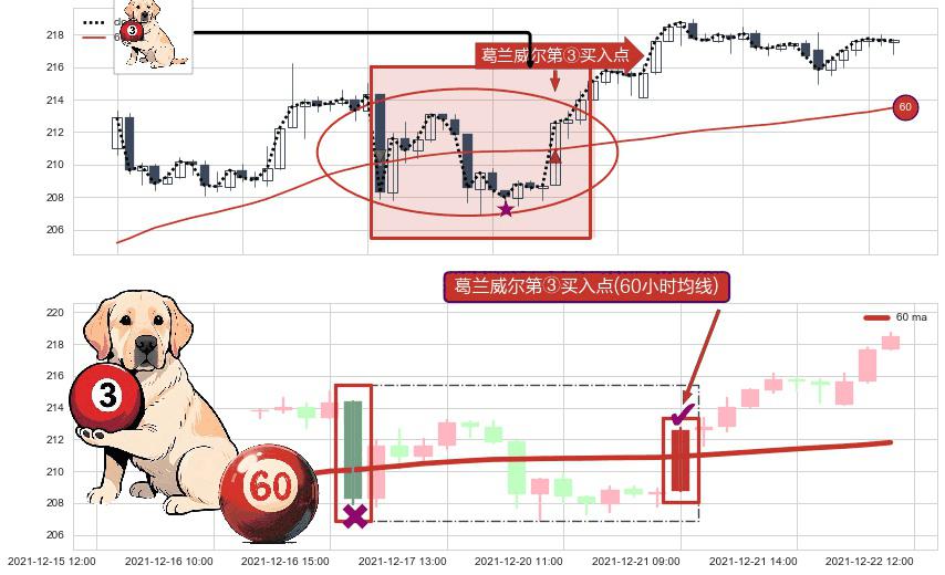 形态多维评估: ⚀ 2021-12-21 09:00:00-小时显现 葛兰威尔均线 60小时均线 第③买入点 上升趋势的中继信号,后市看涨,买进信号