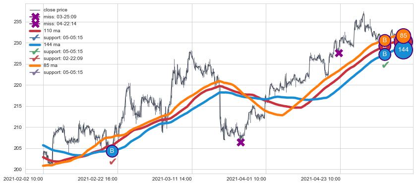 上涨趋势02-02 10:00-05-07 15:00,均线144, 85, 110确认关键支撑2处