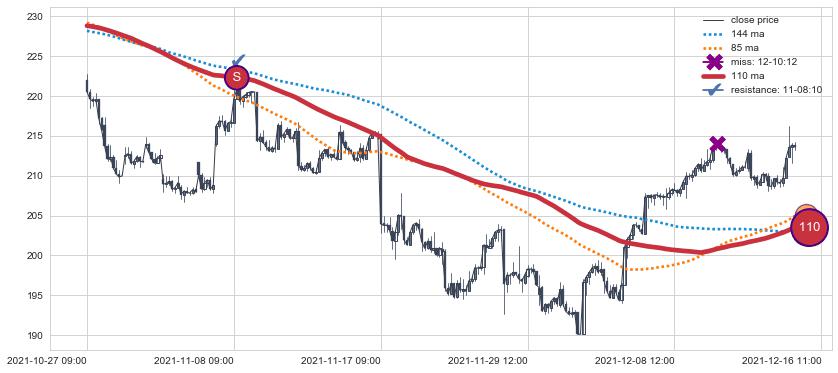 下跌趋势10-27 09:00-12-16 11:00,均线110确认关键阻力1处