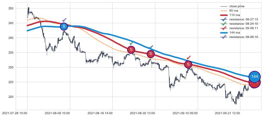 下跌趋势07-28 15:00-09-23 09:00,均线144, 110确认关键阻力4处