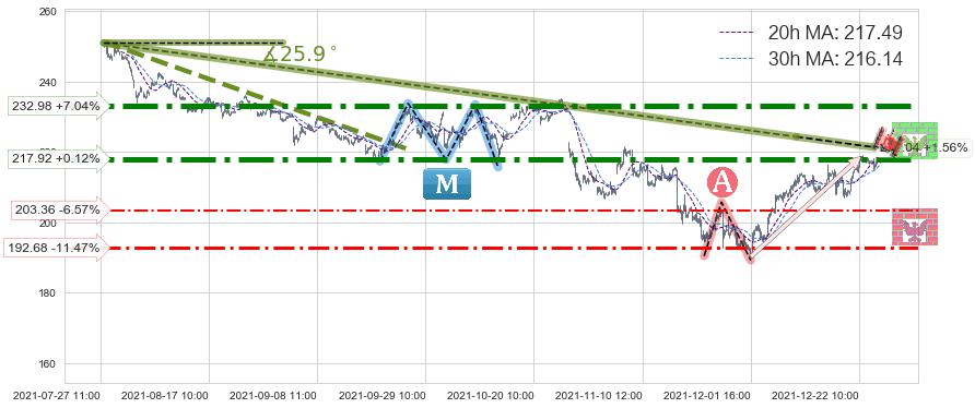 ♘ 阻力价格位217.92,可信任强度87.06%,距离最后交易2021-12-27 15:00形成的收盘价格217.65相差 +0.12%