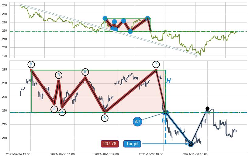 🦴 长线均值回复组合短线趋势跟踪[强阻力信号]2021-07-27 14:00-2021-12-09 15:00下跌趋势依然成立(下跌趋势跟踪依然存在),短线价格略微上行反弹(均值回复猜想),即将接近下跌趋势提供的未破位阻力价格:221.04。