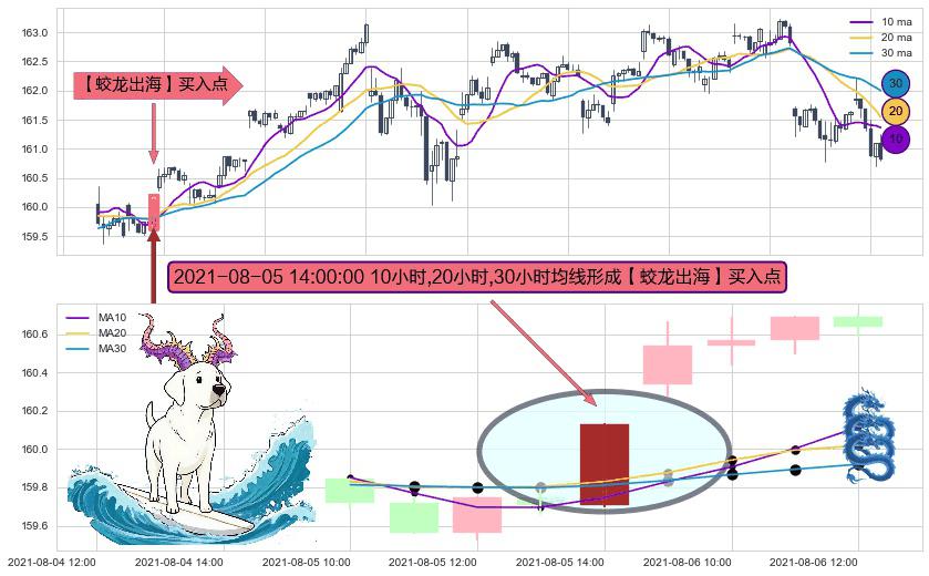 形态多维评估: ⚀ 2021-08-05 14:00:00小时显现 10小时-20小时-30小时均线 【蛟龙出海】买入点 看多信号,后市看涨,买入