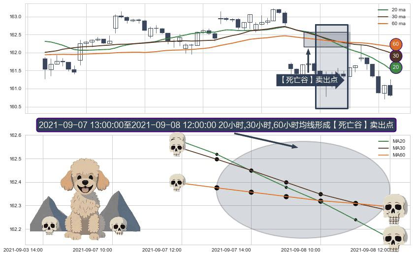形态多维评估: ⚀ 2021-09-07 14:00:00-小时至2021-09-08 12:00:00-小时显现 20小时-30小时-60小时均线 【死亡谷】卖出点 看空信号,后市看跌,卖出