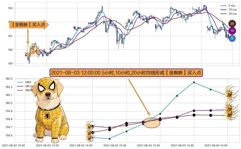 形态多维评估: ⚀ 2021-08-03 12:00:00小时显现 5小时-10小时-20小时均线 【金蜘蛛】买入点 看多信号,后市看涨,买入