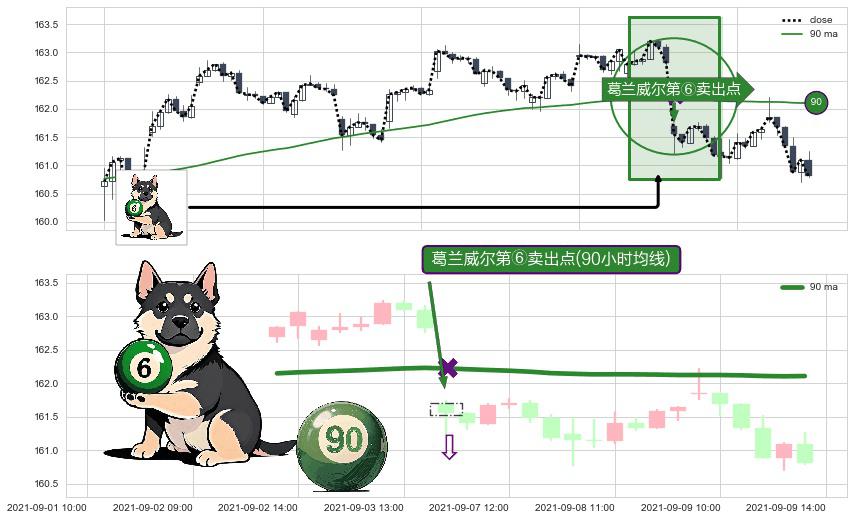 形态多维评估: ⚀ 2021-09-07 09:00:00-小时显现 葛兰威尔均线 90小时均线 第⑥卖出点 走势反转见顶信号,后市看跌,卖出信号