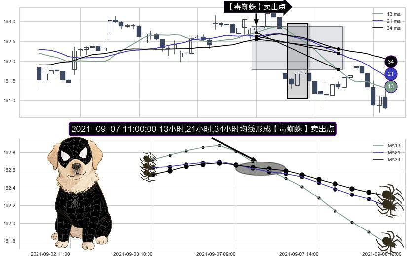 形态多维评估: ⚀ 2021-09-07 11:00:00小时显现 13小时-21小时-34小时均线 【毒蜘蛛】卖出点 看空信号,后市看跌,卖出