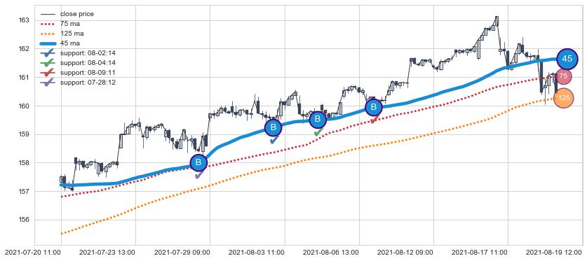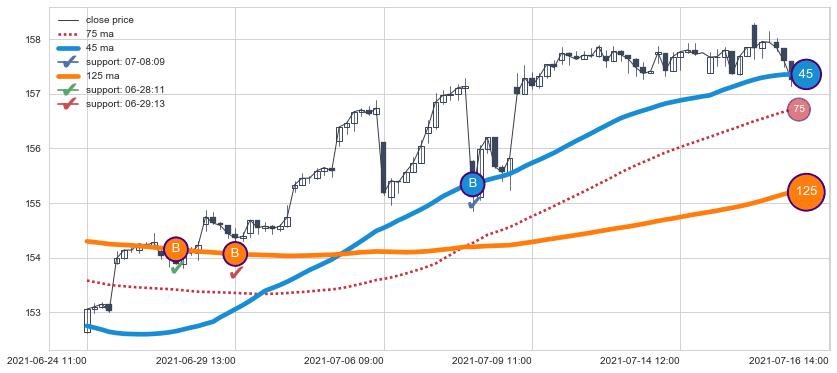 上涨趋势06-24 11:00-07-16 14:00,均线125, 45确认关键支撑3处