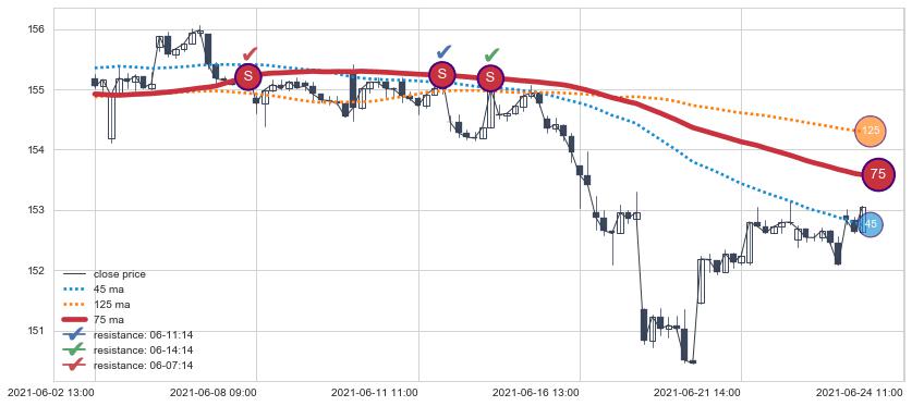 下跌趋势06-02 13:00-06-24 11:00,均线75确认关键阻力3处