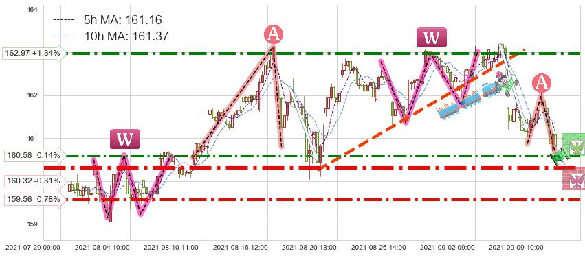 ♞ 5小时均线:161.16,10小时均线:161.37→ 快线<慢线