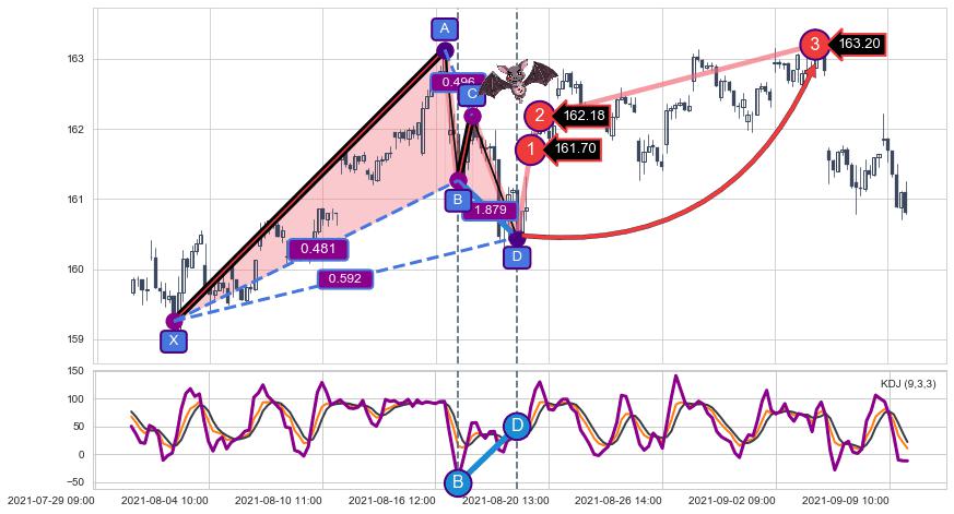 ➣ 已完成【蝙蝠】形态起点X: 08-02:14, 终点D: 08-19:12, 共77交易小时