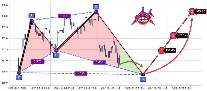 ➢ 接近预测D点位置, 随时警戒看涨【鲨鱼】形态反转启动