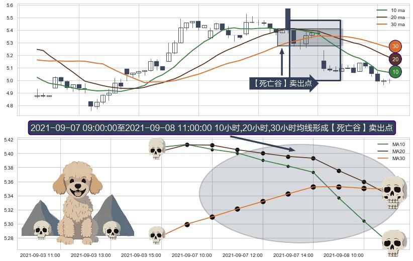 形态多维评估: ⚀ 2021-09-07 10:00:00-小时至2021-09-08 11:00:00-小时显现 10小时-20小时-30小时均线 【死亡谷】卖出点 看空信号,后市看跌,卖出
