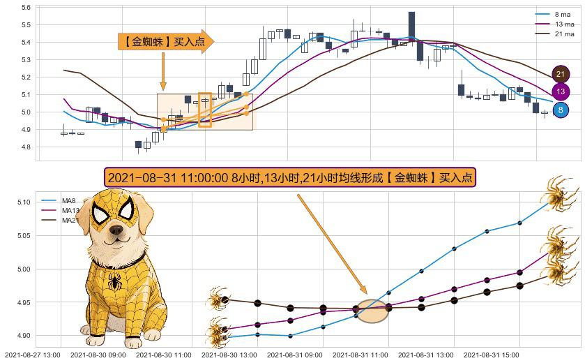 形态多维评估: ⚀ 2021-08-31 11:00:00小时显现 8小时-13小时-21小时均线 【金蜘蛛】买入点 看多信号,后市看涨,买入