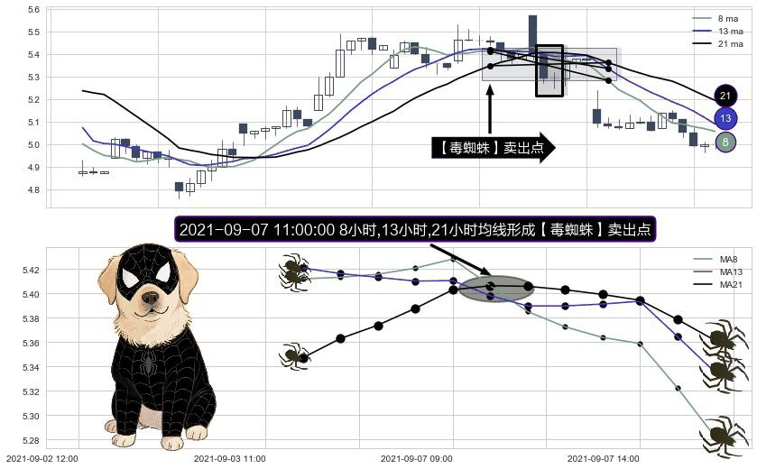 形态多维评估: ⚀ 2021-09-07 11:00:00小时显现 8小时-13小时-21小时均线 【毒蜘蛛】卖出点 看空信号,后市看跌,卖出