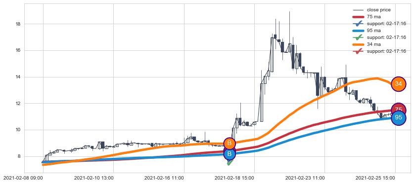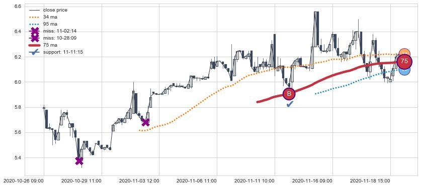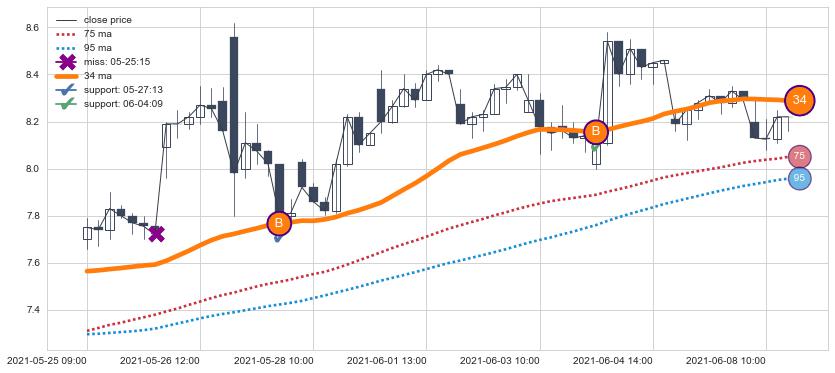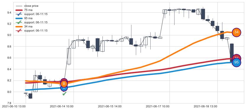 上涨趋势06-10 13:00-06-21 09:00,均线34, 75, 95确认关键支撑1处