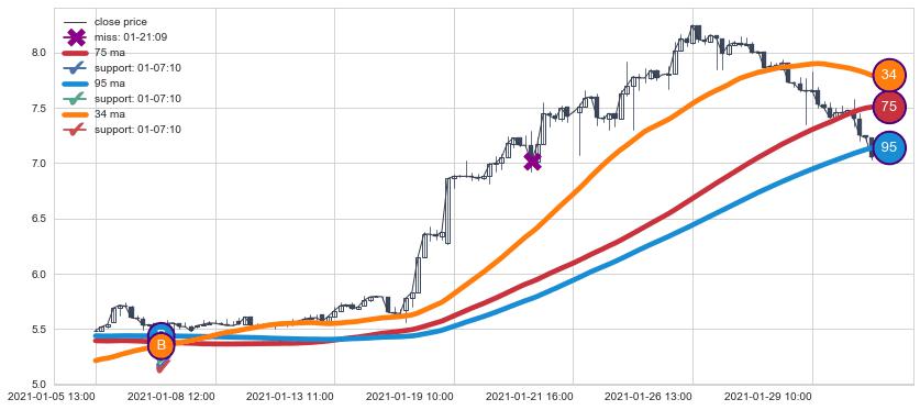 上涨趋势01-05 13:00-02-01 12:00,均线34, 75, 95确认关键支撑1处