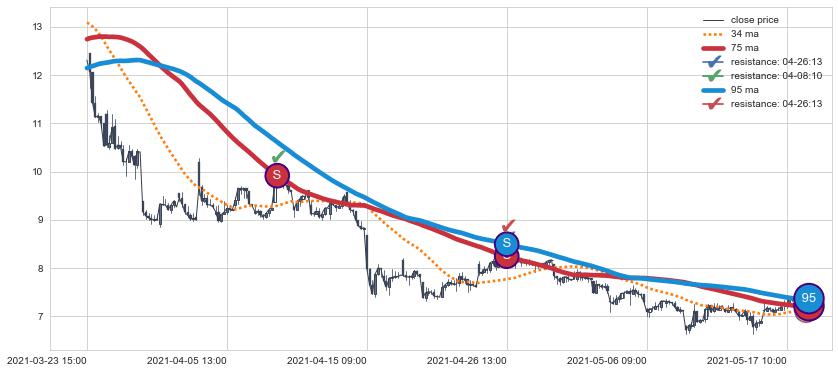 下跌趋势03-23 15:00-05-17 13:00,均线75, 95确认关键阻力2处