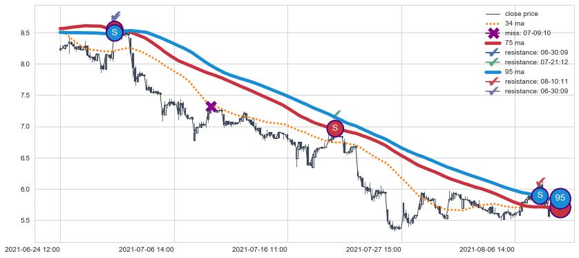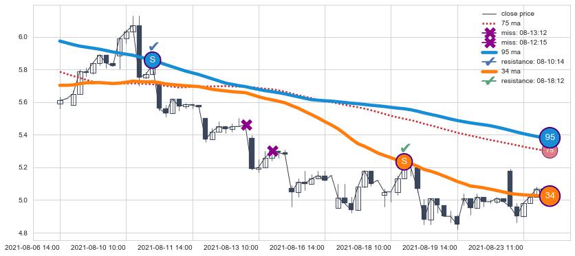 下跌趋势08-06 14:00-08-23 14:00,均线34, 95确认关键阻力2处