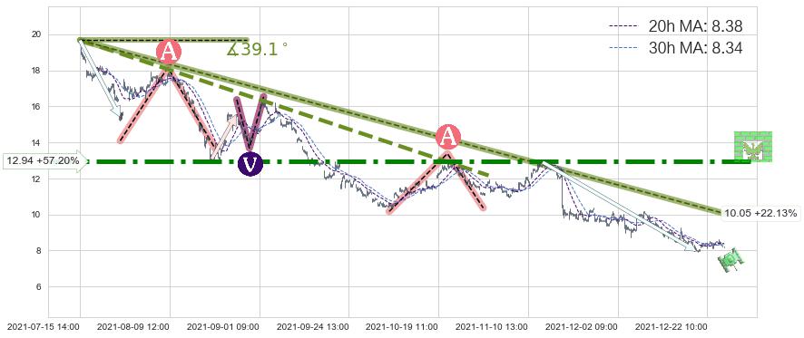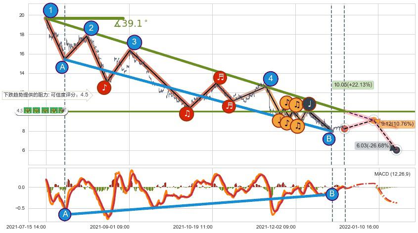 从2021-07-15 14:00至2021-12-27 14:00,共包含719个小时,阶段股价下跌-77.69%,阶段股价变动位移路程比: 1 : 8,下跌趋势角度: 39.1