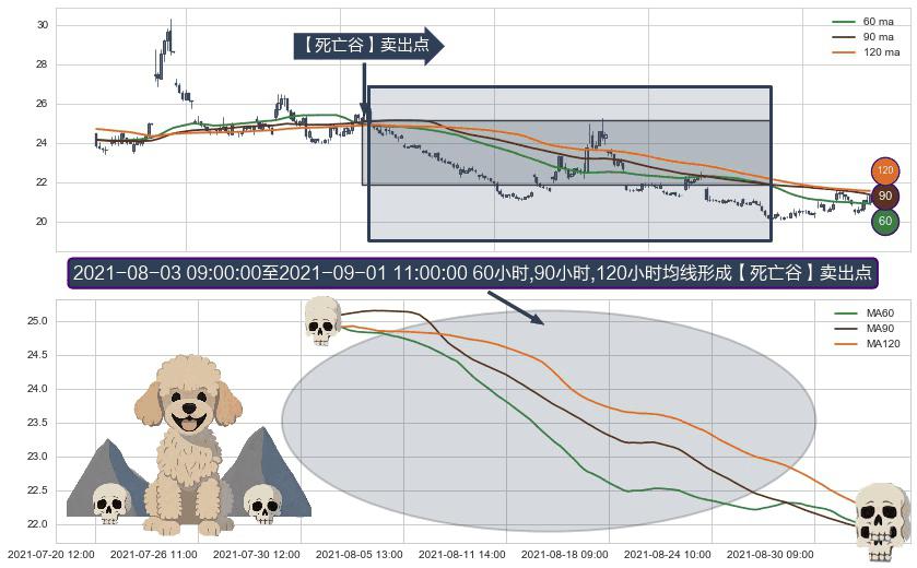 ⚀ 2021-08-03 10:00:00-小时至2021-09-01 11:00:00-小时显现 60小时-90小时-120小时均线 【死亡谷】卖出点 看空信号,后市看跌,卖出