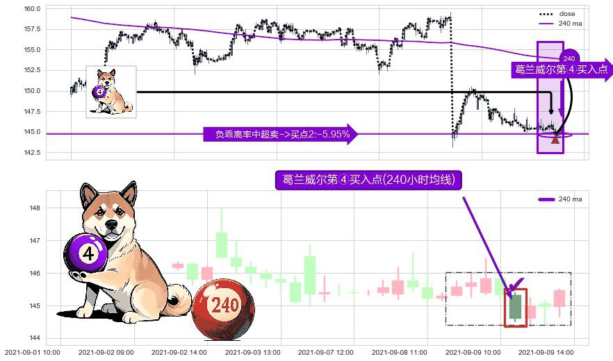 形态多维评估: ⚀ 2021-09-09 11:00:00-小时显现 葛兰威尔均线 240小时均线 第④买入点 下降趋势均值回复的短线反弹信号,后市看涨,买进信号