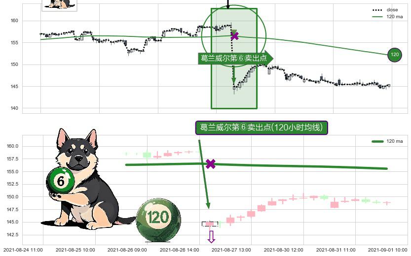 形态多维评估: ⚀ 2021-08-27 09:00:00-小时显现 葛兰威尔均线 120小时均线 第⑥卖出点 走势反转见顶信号,后市看跌,卖出信号