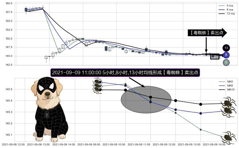 形态多维评估: ⚀ 2021-09-09 11:00:00小时显现 5小时-8小时-13小时均线 【毒蜘蛛】卖出点 看空信号,后市看跌,卖出