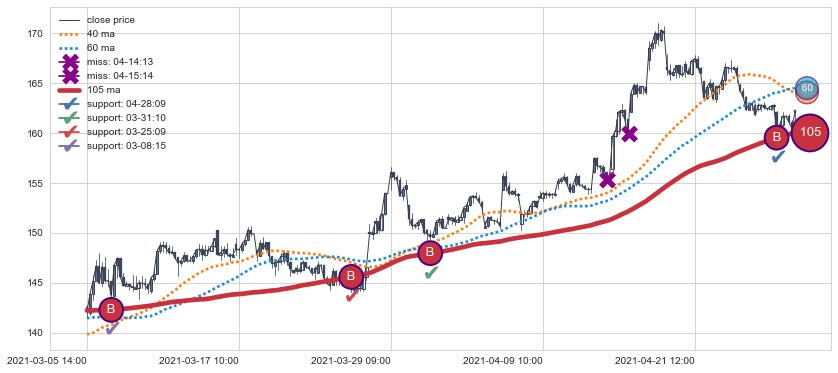 上涨趋势03-05 14:00-04-29 09:00,均线105确认关键支撑4处