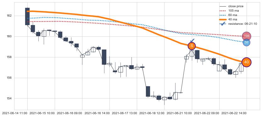下跌趋势06-14 11:00-06-22 14:00,均线40确认关键阻力1处