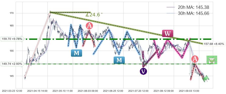 ♘ 在最后的下跌阶段2021-04-19 13:00至2021-09-09 14:00,存在 持续未破位的阻力位 ,阻力价格157.68,可信任强度83.97%,其距离最后价格145.47相差 +8.40%