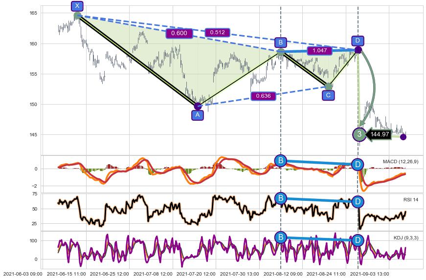 ➢ 谐波价格D点比B点高 ⤴,【KDJ】指标D点比B点低 ⤵️