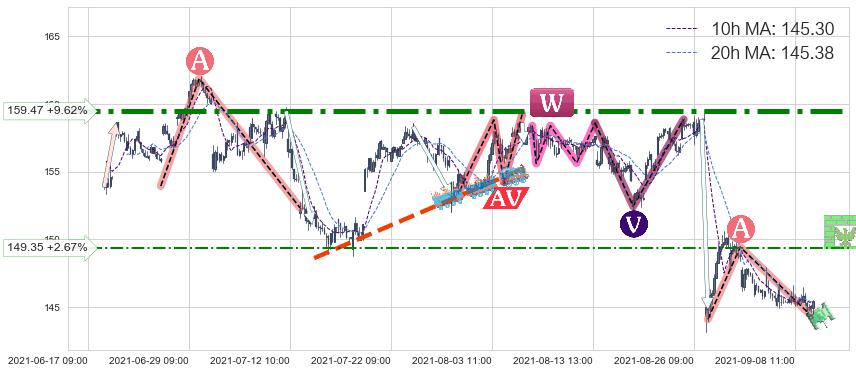 ♘ 阻力价格位149.35,可信任强度46.25%,距离最后交易2021-09-09 14:00形成的收盘价格145.47相差 +2.67%