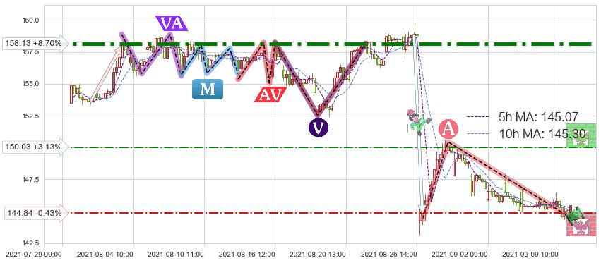 ♘ 阻力价格位150.03,可信任强度48.74%,距离最后交易2021-09-09 14:00形成的收盘价格145.47相差 +3.13%