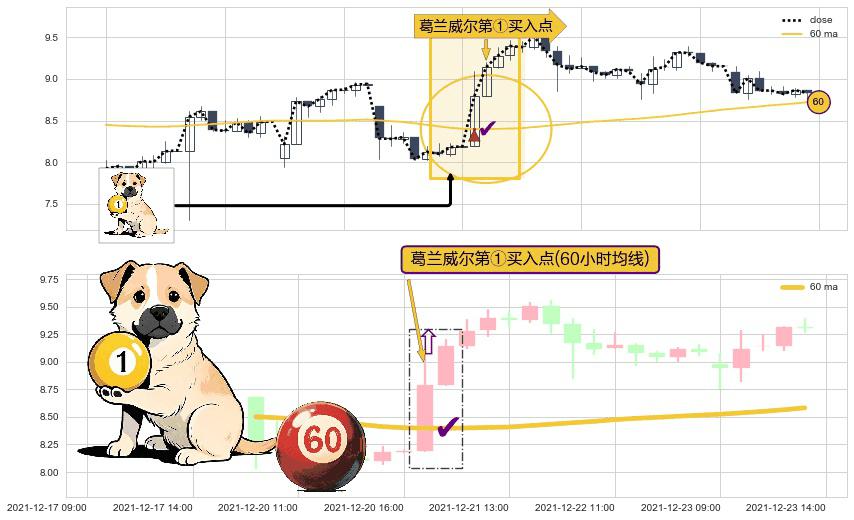 ⚀ 2021-12-21 09:00:00-小时显现 葛兰威尔均线 60小时均线 第买①入点 走势反转见底信号,后市看涨,买进信号