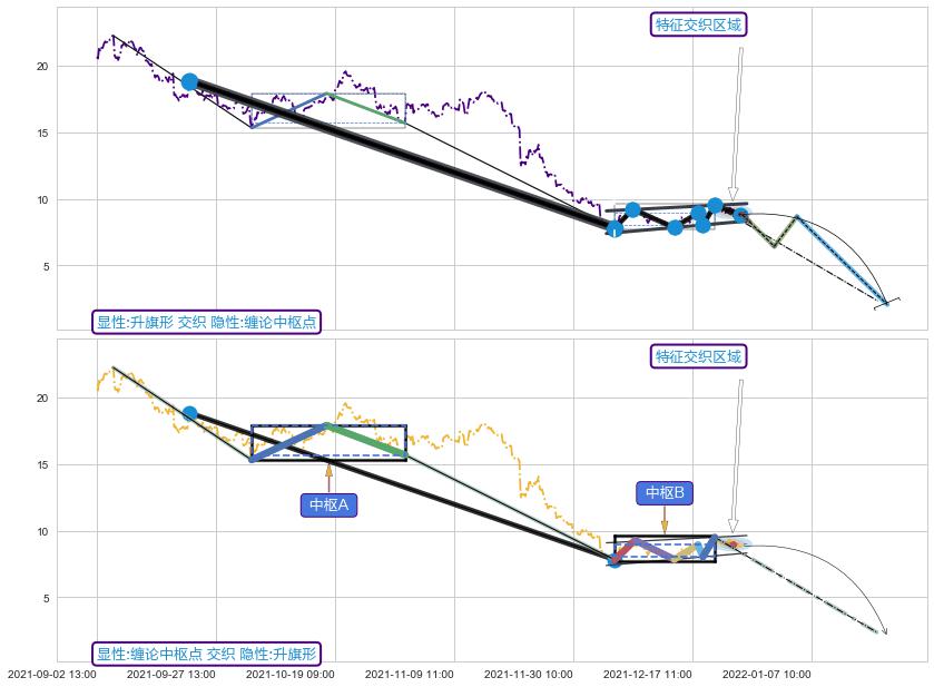 ➣ 【中枢B】:12-06:14-12-21:14,中枢由6笔构成,共85交易小时, ZG=8.94, ZD=8.04